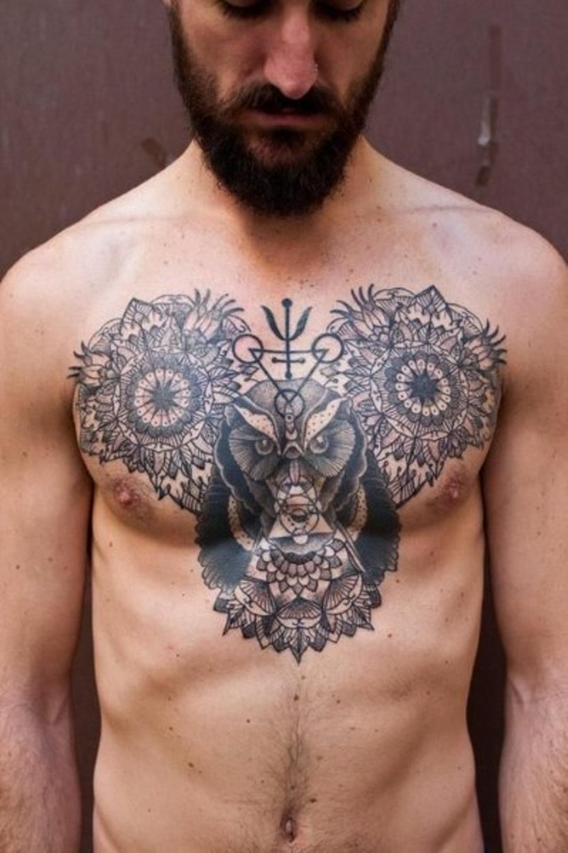 chest mysterious Brahma flower and owl symbol tattoo pattern